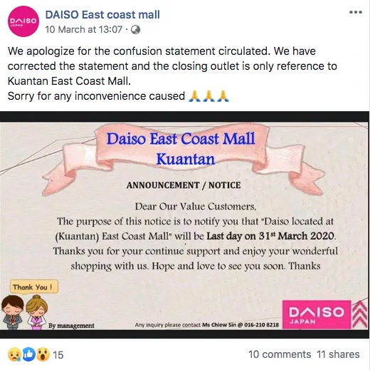 Namun, dilihat orang ramai terkeliru dan salah anggap dengan pengemuman ini. Kerana penutupan Daiso haya berlaku di East Coast Mall, Kuantan bukannya semua outlet di seluruh Malaysia.