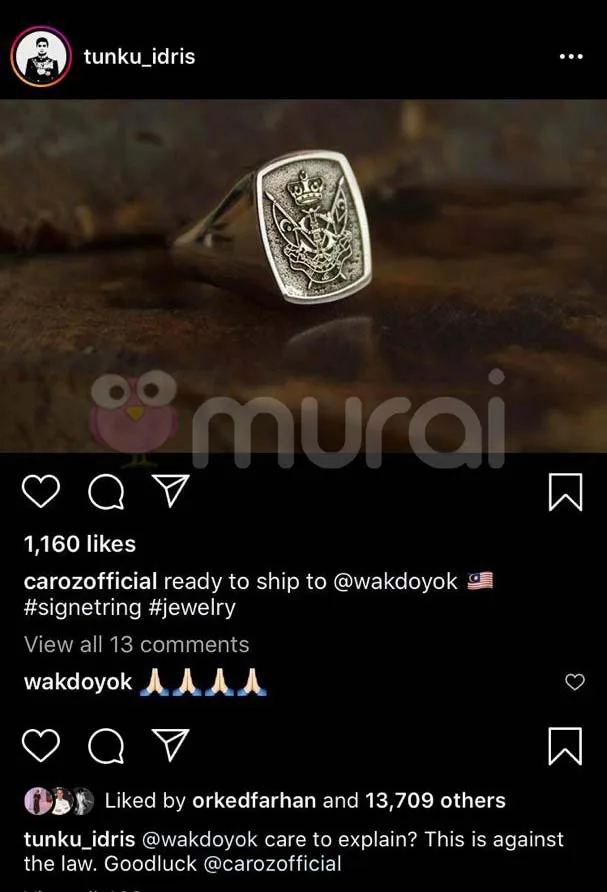 Hal ini mendapat perhatian oleh Tunku Temenggong Johor, Tunku Idris Iskandar. Baru-baru ini baginda telah mendedahkan kesalahan sebuah akaun Instagram yang merupakan pemilik perniagaan jam tangan dan barang kemas. Pemilik akaun bernama Caroz Wooden tersebut didakwa telah menghasilkan sebentuk cincin dengan ukiran lambang diraja Johor.