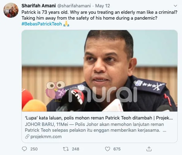 “Patrick berumur 73 tahun. Kenapa anda memperlakukan lelaki tua ini seperti penjenayah? Bawa dia dari rumahnya yang selamat semasa wabak Covid-19?”- tulisnya di twitter