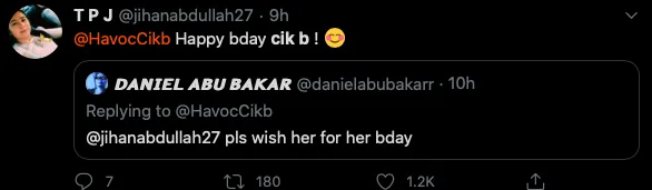 Lebih manis, anakanda bongsu Yang di-Pertuan Agong, Al-Sultan Abdullah Ri’ayatuddin Al-Mustafa Billah Shah iaitu Tengku Puteri Jihan Azizah Athiyatullah turut menyampaikan ucapan ringkas selamat hari lahir buat Cik B di laman Twitter. Selamat hari lahir Cik B dari kami di Murai.my.