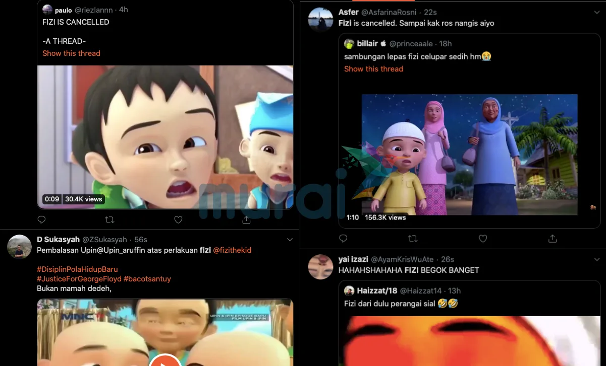 Sejak semalam, salah satu karakter dalam animasi Upin & Ipin iaitu Fizi, trending di tangga pertama laman Twitter selepas salah satu video babak dalam episod Aidilfitri tular di laman sosial itu.