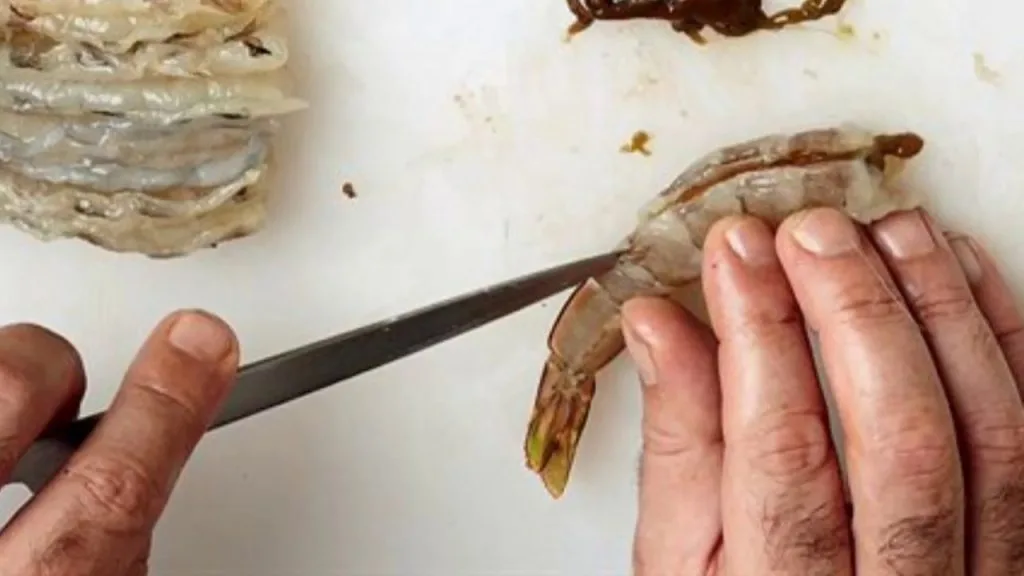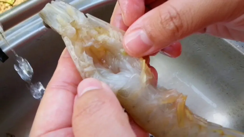 Jika dilihat dengan teliti, untuk udang yang bersaiz sederhana ataupun besar, terdapat satu garisan lurus berwarna hitam di bahagian belakang badan udang. Ini adalah bahagian najis udang. Jadi pastikan anda membuang bahagian ini ketika membersih udang.