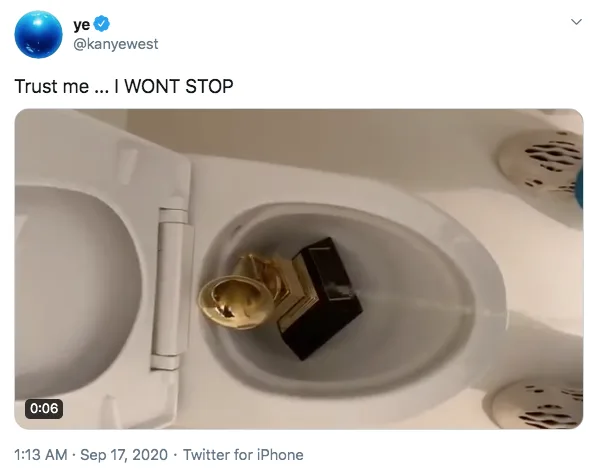 Bukannya diperlakukan dengan baik, Kanye West malah meletakkan trofi itu di dalam mangkuk jamban. Kemudian dalam video tersebut terlihat aliran air yang membuat orang percaya bahawa suami Kim Kardashian itu sedang buang air kecil di pialanya.