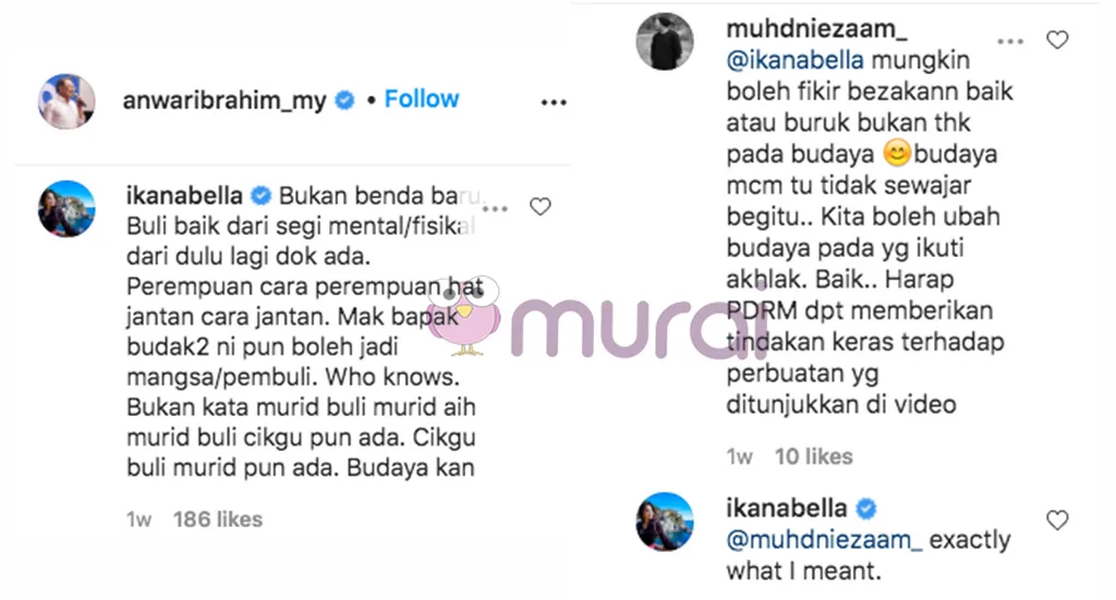 Ika meluahkan pendapat ini menerusi salah satu posting yang dikeluarkan oleh Presiden Parti Keadilan Rakyat (PKR), Datuk Seri Anwar Ibrahim di Instagram beliau. Dalam instagram rasminya, Anwar memuatnaik sebuah video singkat memaparkan kelakuan tidak bermoral sekumpulan pelajar membuli seorang budak lelaki di sebuah bilik asrama. Anwar menggambarkan kes buli ini sebagai budaya sial.