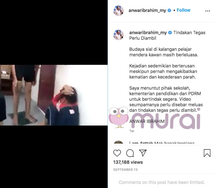 Saya menuntut pihak sekolah, kementerian pendidikan dan PDRM untuk bertindak segera. Video seumpamanya perlu disebar meluas dan tindakan tegas perlu diambil.”- tulis Anwar di ruangan kapsyen.