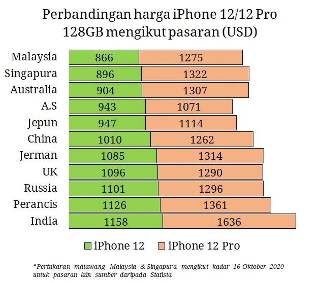Dalam perkembangan lain, harga jualan iPhone 12 di Malaysia dikatakan antara yang paling murah jika dibandingkan dengan pasaran 10 negara utama lain.