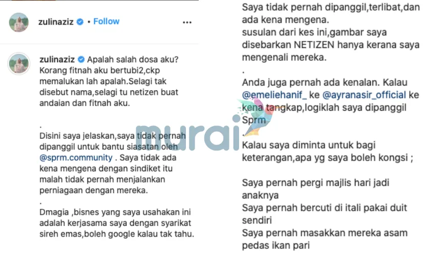“Di sini saya jelaskan, saya tidak pernah dipanggil untuk bantu siasatan oleh @sprm.community. Saya tidak ada kena mengena dengan sindiket itu malah tidak pernah menjalankan perniagaan dengan mereka,” tulis Zulin