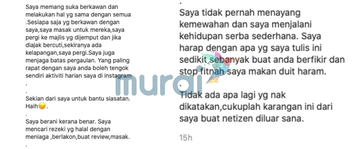 “Apalah salah dosa aku? Korang fitnah aku bertubi-tubi, cakap memalukanlah apalah…Selagi tak disebut nama, selagi tu netizen buat andaian dan fitnah aku.