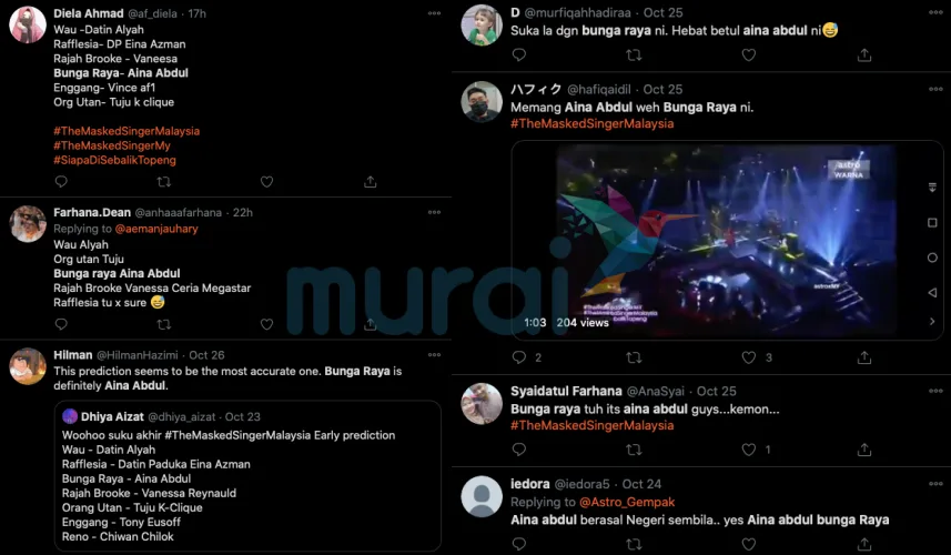 Dalam pada itu, perhatian turut diberikan buat salah seorang peserta yang memakai kostum Bunga Raya yang dilihat antara saingan yang cukup sengit di kalangan semua finalis. Rata-rata peminat telah meneka bahawa figura disebalik kostum itu adalah penyanyi popular, Aina Abdul.
