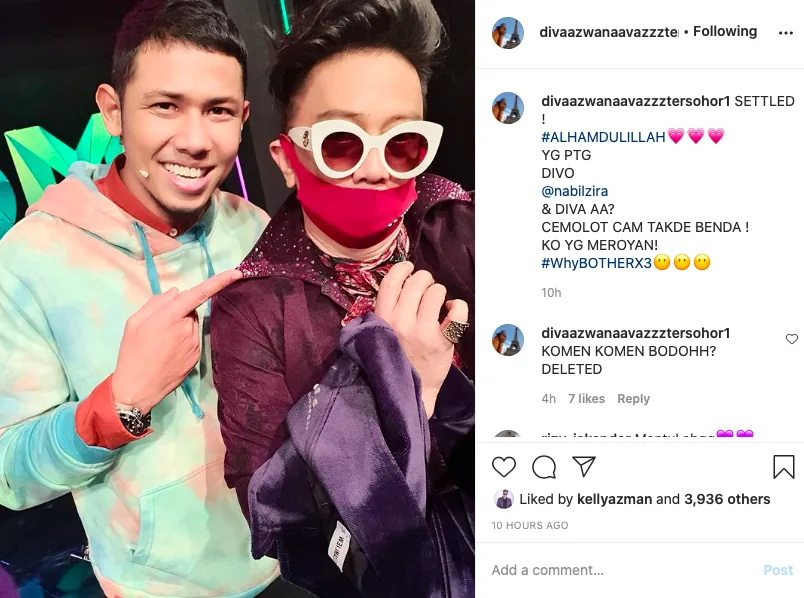 “Settled! Alhamdulillah! Yang penting Divo @nabilzira & Diva AA cemolot macam tak ada benda! Ko yang meroyan! #WhyBotherX3” tulis Diva AA di laman Instagram nya