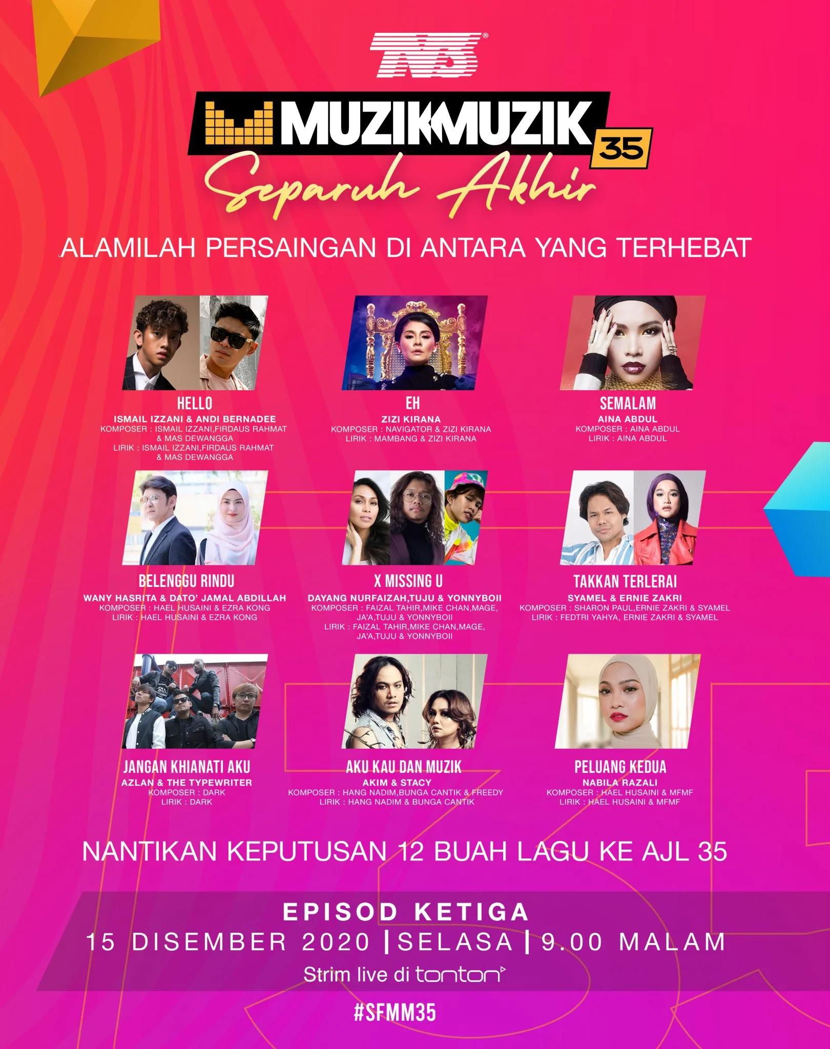 Setelah menantikan tarikh rasmi bagi hari ketiga Separuh Akhir Muzik Muzik 35 (SFMM35), produksi kini mengumumkan ianya akan bersiaran pada hari Selasa, 15 Disember 2020.
