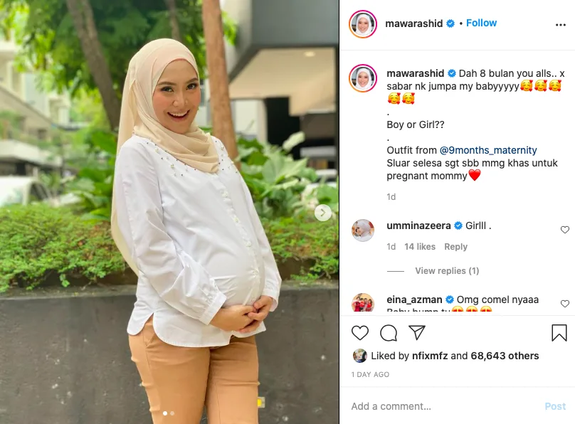 Selain Zahirah, pelakon Mawar Rashid juga sedang sarat mengandung dan turut berkongsi usia kehamilan yang sama iaitu 8 bulan. Menerusi hantaran di laman Instagram, Mawar yang berkahwin dengan adik selebriti popular Datuk Fazley Yaakob, Raf Yaakob memuat naik foto terkininya yang meminta peminat untuk meneka adakah anak kedua nya bersama Raf seorang bayi lelaki mahupun perempuan.