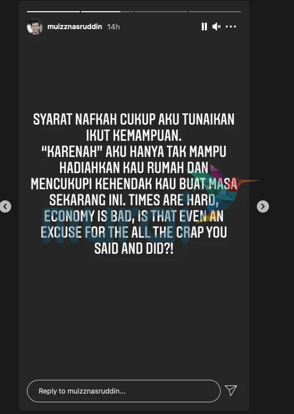 Dalam pada itu, Muizz juga memberitahu dia telah menunaikan segala tuntutan nafkah mengikut kemampuannya kecuali tidak mampu menghadiahkan Nadia sebuah rumah ketika ini berikutan keadaan ekonomi yang teruk. Kesal dengan khabar yang tidak benar mengenainya, Muizz turut berharap agar isterinya itu tidak lagi berbuat demikian agar dia juga tidak lagi mendedahkan perkara yang sebenar.