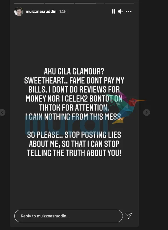 “Saya tidak dapat apa-apa hasil daripada masalah ini. Jadi, Tolong hentikan bercakap perkara tidak benar mengenai saya supaya saya akan berhenti sebarkan kebenaran tentang awak,” tulisya lagi.