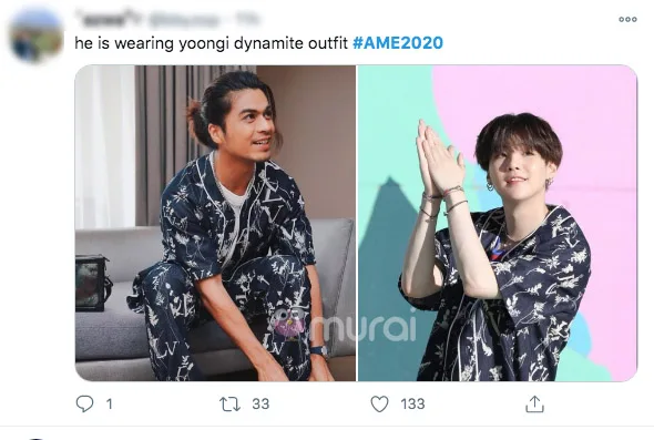 Hal ini telah di ‘kantoi’- kan oleh salah seorang netizen di twitter. Menurut pengguna twitter ini, pakaian yang dikenakan oleh Ben sama dengan Suga BTS ketika muncul dalam Muzik Video BTS berjudul Dynamite.
