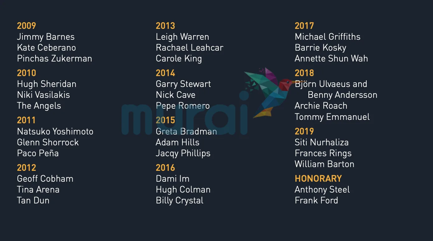 Setiap tahun sebanyak nama tiga bintang antarabangsa bakal dipahatkan dalam Walk Of Fame di Sungai Torrens, Adelaide Australia yang mana pengiktirafan ini diberikan buat mereka yang pernah melakar sejarah di pentas Adelaide Festival Centre sejak ia mula dibuka pada tahun 1973.