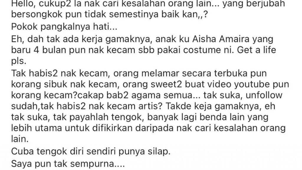 “Get a life Please! Tak habis-habis nak kecam, orangmelamar secara terbuka pun korang sibuk nak kecam, orang sweet-sweet buat video dalam Youtube pun korang nak kecam? Cakap bab bab agama semua. Tak suka, unfollow, tak payahlah tengok, banyak lagi benda lain yang lebih utama untuk difikirkan daripada nak cari kesalahan orang lain.”
