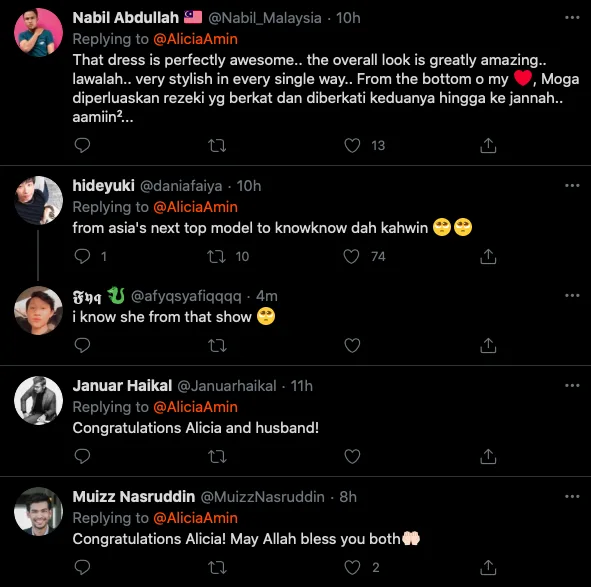 Biarpun ramai yang terkejut apabila model terkenal itu secara tiba-tiba berkongsi mengenai pernikahannya, namun rata-rata daripada mereka meluahkan rasa gembira serta mendoakan agar rumahtangga yang dibina oleh Alicia dan suami berkekalan sehingga ke akhir hayat.