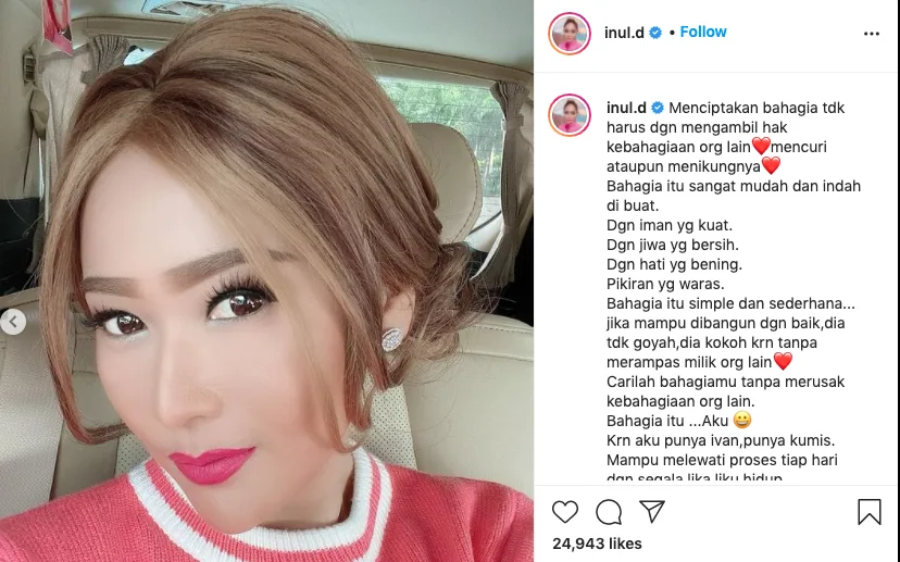 Dalam muat naik itu, Inul menulis bahawa mewujudkan kebahagiaan tidak perlu menyakiti orang lain.