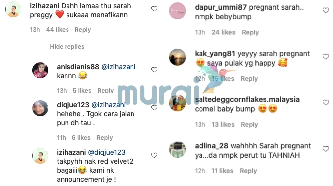 Menjengah ke ruangan komen, rata-rata peminat membanjiri dengan pelbagai pertanyaan kepada pelantun Terakhir Buat Teman itu untuk mengesahkan dirinya kini sedang hamil dan dalam masa yang sama turut mengucapkan tahniah buat mereka sekeluarga. Dalam pada itu, pihak Murai.my turut menantikan pengesahan daripada sumber terdekat pasangan selebriti ini mengenai status terkini Sarah.