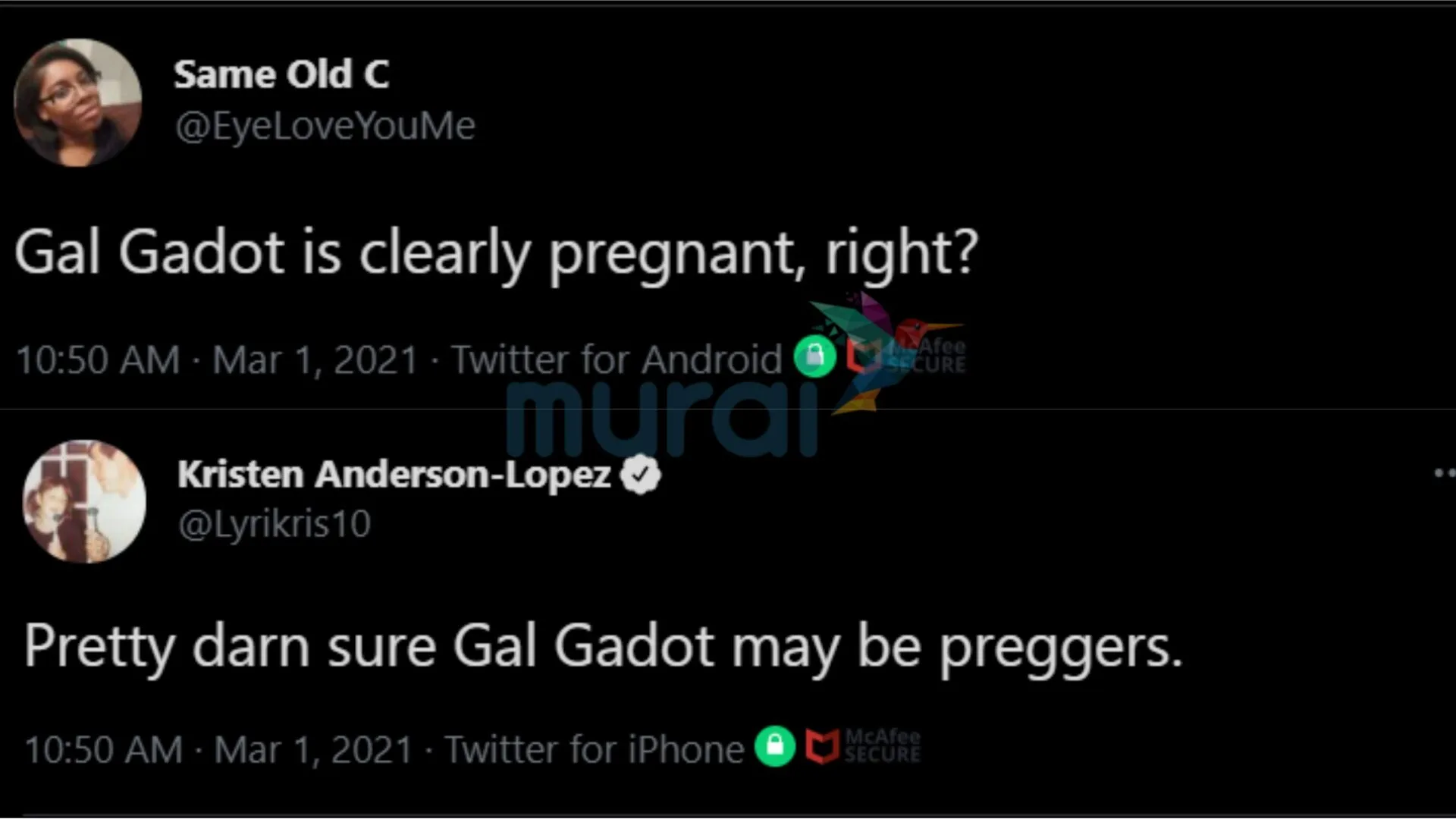 Namun, berikutan pakaiannya yang lebih longgar, spekulasi kehamilan Gal Gadot mula membanjiri di laman Twitter. penulis lagu ‘Frozen’, Kristen Anderson-Lopez turut menulis di laman twitter nya yang menyatakan bahawa beliau yakin Gal Gadot mungkin hamil.