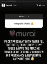 “Jika saya hamil dengan anak kembar saya akan melahirkannya, tutup kedai dan ikat peranakan (elak kehamilan) dan dapatkan hak istimewa yang luar biasa untuk menerima dua anak dalam satu kehamilan. Dan tidak akan mempunyai anak lagi.”- tulisnya