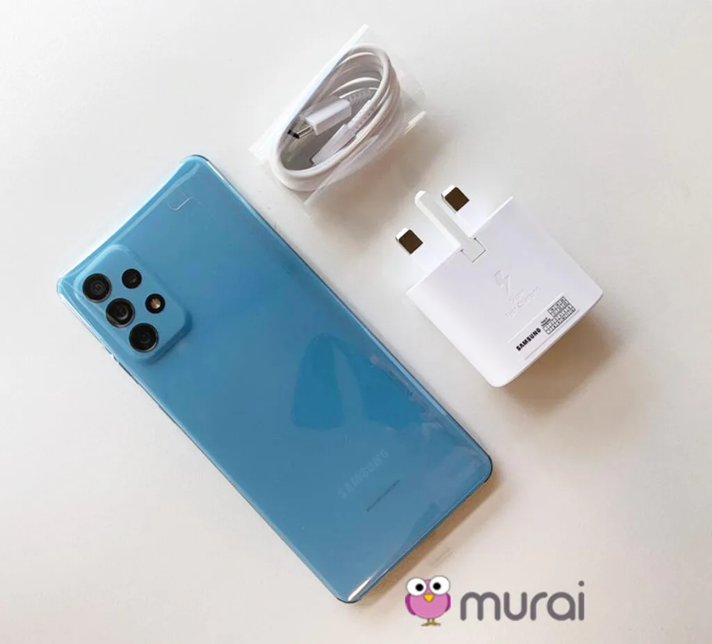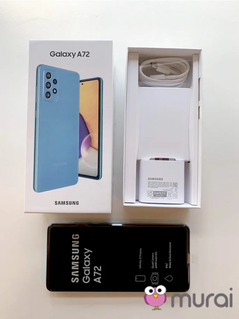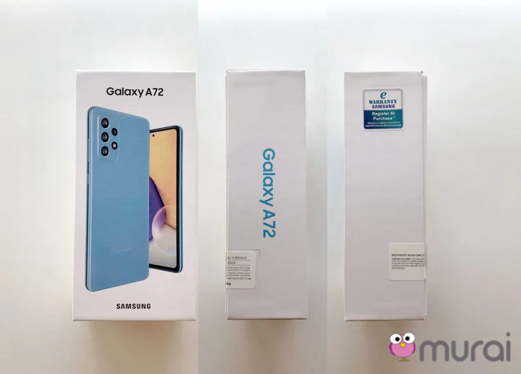 Kotak pembungkusan Galaxy A72 dikuasai oleh warna putih. Terdapat tulisan “Galaxy A72” yang disertakan dengan penampilan telefon bimbit, dan logo Samsung. Galaxy A72 tersedia dengan 4 pilihan warna iaitu Awesome Violet, Awesome Blue, Awesome Black, dan Awesome White 14 dan kami mendapat warna biru/ Awesome Blue.