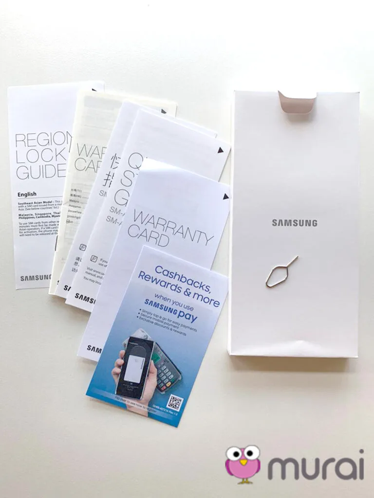Kad jaminan, buku panduan dalam pelbagai bahasa dan alat ejector slot kad SIM diletakkan berasingan dalam kotak nipis.