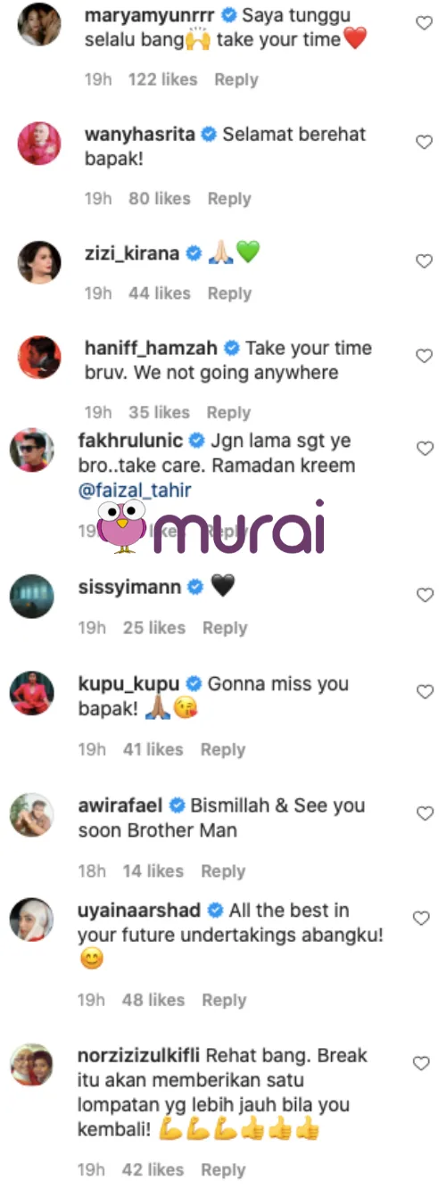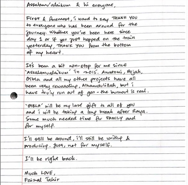 Tidak dilupakan, para peminat turut berterima kasih kepada Faizal atas penghasilan karya-karya terbaik nya selama ini. Bagaimanapun, ujar Faizal ‘hiatus’ ini hanyalah sementara kerana dia akan kembali bila tiba masanya selain akan terus menulis lagu buat penyanyi lain.