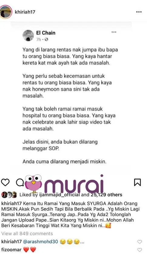 Malah pelakon ini juga berkongsi pesanan mengenai syurga yang mana orang yang miskin lebih ramai masuk ke syurga. Di kesempatan itu, Noorkhiriah turut berpesan kepada ‘golongan’ tersebut untuk berhenti kongsi mengenai kebenaran rentas negeri yang diperoleh mereka kerana kasihan kepada mereka yang tidak dapat berbuat demikian bagi mematuhi SOP yang telah ditetapkan. Bagaimanapun, menerusi carian terbaru Murai.my mendapati hantaran tersebut telah pun dipadam oleh Noorkhiriah.