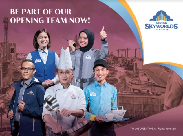 “Di samping mempunyai tarikan dan pengalaman yang bertaraf antarabangsa di Taman Tema Genting SkyWorlds, pihak kami akan sentiasa berusaha untuk menawarkan perkhidmatan pelanggan dan hospitaliti yang terbaik melalui interaksi yang diberikan oleh ahli pasukan kami yang bersemangat dan dinamik. Kami sedang mencari individu yang ceria, bersemangat dan berdedikasi untuk pasukan pembukaan kami. Ini merupakan peluang sekali seumur hidup dan kami tidak sabar untuk menyaksikan semua bakat yang kreatif di acara-acara pengambilan pekerja kami,” kata Encik Gregory Pearn, Ketua Taman Tema dan Pengalaman, Resorts World Genting.