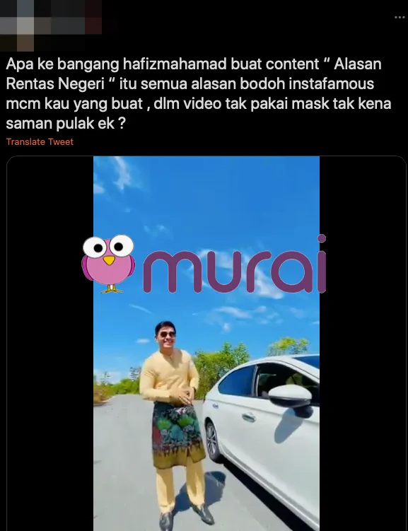 Bagaimanapun, menerusi carian Murai.my,rata-rata netizen mempertikaikan tindakan Hafiz adakah mendapat kebenaran daripada pihak berkuasa untuk menggunakan petugas hadapan yang memakai baju seragam penuh selain usahawan itu turut didapati melanggar SOP (tidak memakai pelitup muka).