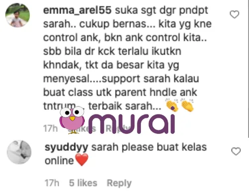 Rata-rata peminat yang menonton perkongsian Sarah bersetuju dengan pandangannya dalam mendidik anak-anak. Malah ada diantara mereka meminta pelantun Manis itu membuat kelas secara atas talian mengenai pelbagai perkongsiannya.