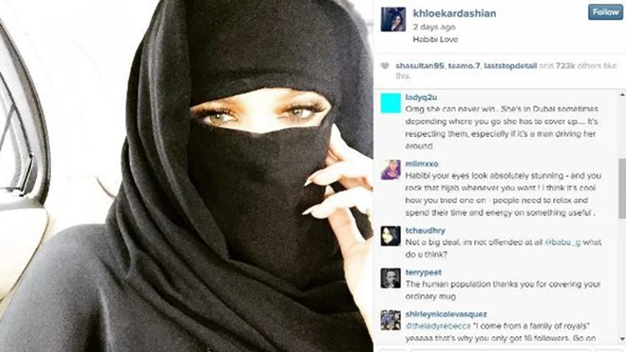 Khloe Kardashian telah memuat naik foto dirinya yang memakai niqab atau tudung dengan menulis perkataan “Habibi Love,”. Tindakan itu mengundang kemarahan netizen yang dianggap tidak sesuai kerana memakai tudung dan pada masa yang sama menghina budaya Islam.