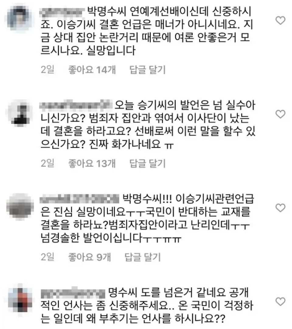 “Park Myung Soo-sshi! Apa yang anda katakan mengenai Lee Seung Gi buat saya benar-benar kecewa. Seluruh negara menentangnya, tetapi anda mahu mereka berkahwin? Nasihat yang tidak sopan.”-Netizen Korea