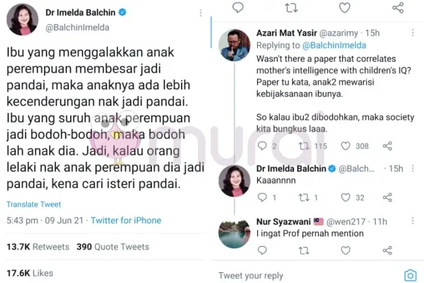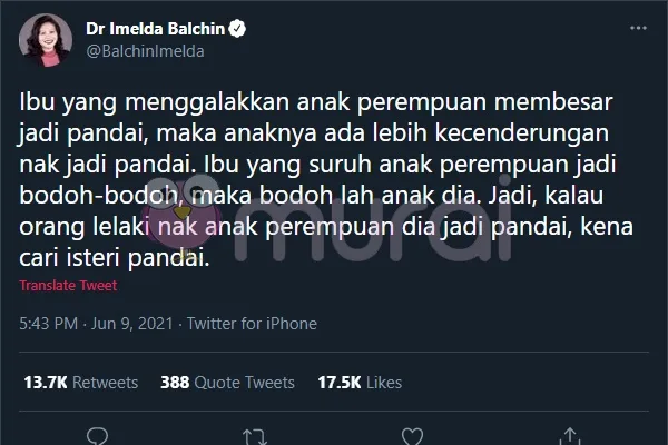 “Ibu yang menggalakkan anak perempuan membesar jadi pandai, maka anaknya ada lebih kecenderungan nak jadi pandai. Ibu yang surh anak perempuan jadi bodoh-bodoh, maka bodohlah anak dia.” Ciap Dr.Imelda di Twitter