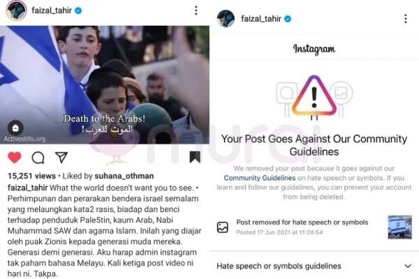 Oleh kerana Faizal Tahir kerap berkongsi maklumat mengenai Palestin dan Israel di Instagram, video yang dimuatnaik di akaun Instagram sering dipadam oleh Instagram kerana menganggap hantaran tersebut berbaur ‘hate speech’ atau mempunyai simbol yang tidak sepatutnya.