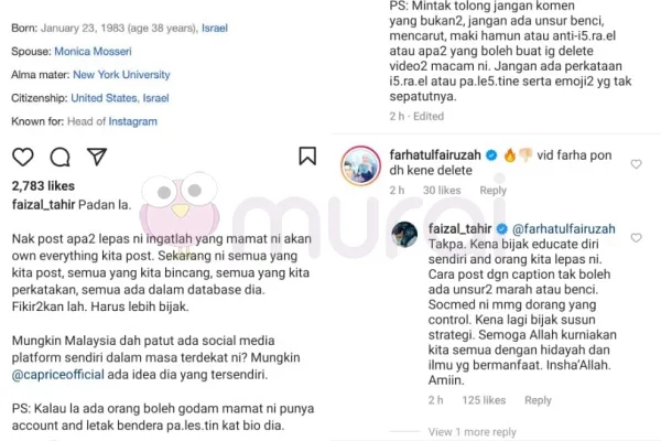 Faizal kemudian mencari siapakah pemilik Instagram kerana setiap kali memuatnaik hantaran mengenai Palestin dan Israel, pasti akan dipadam dan mendapat amaran dari pihak Instagram dan rupa-rupa pemilik sosial media popular ini dimiliki oleh orang Israel yang bernama Adam Mosseri.