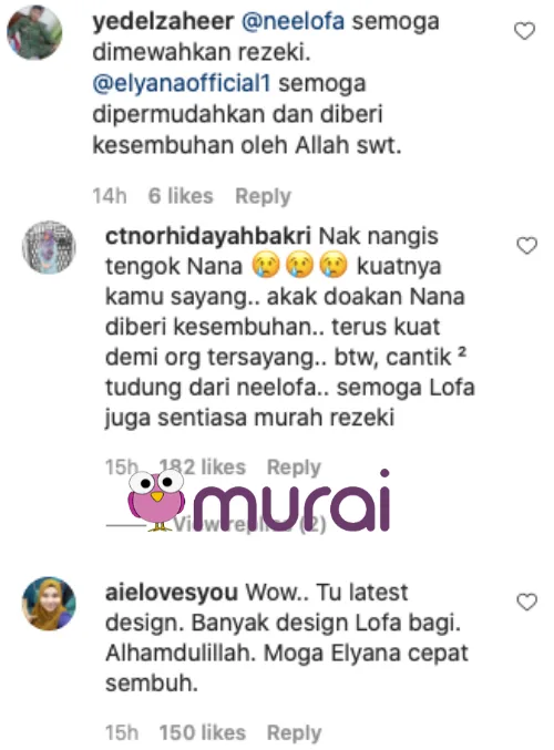 Malah mereka turut menitipkan doa buat Neelofa untuk terus dimurahkan rezeki selain mendoakan Elyana diberikan kesembuhan segera. Sebagai info, Elyana kini sedang melawan penyakit kanser limfoma tahap lima yang dihidapinya sejak hampir 10 tahun lalu.