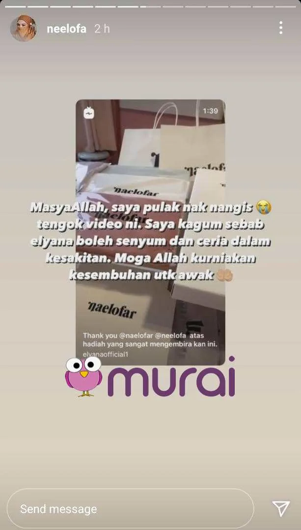 Dalam pada itu, Neelofa turut mengulang siar video Elyana di Insta story nya. Akui sebak menonton video tersebut, jelas isteri kepada PU Riz itu dia berasa kagum dengan semangat Elyana untuk terus kuat melawan penyakit kanser yang dihidapinya.