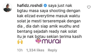 “saya just nak bagitau masa saya shooting dengan kak elizad everytime masuk waktu solat je mesti terserempak dengan dia , dia dah siap amik wudhu and bentang sejadah ready nak solat itu je nak bgtau sekian terima kasih” dedah Hafidz