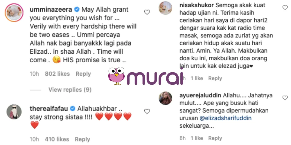 Rata-rata peminat dan rakan-rakan selebriti menitipkan kata-kata semangat buat Elizad selain mendoakan agar pelakon ini dikurniakan seorang cahaya mata kelak.