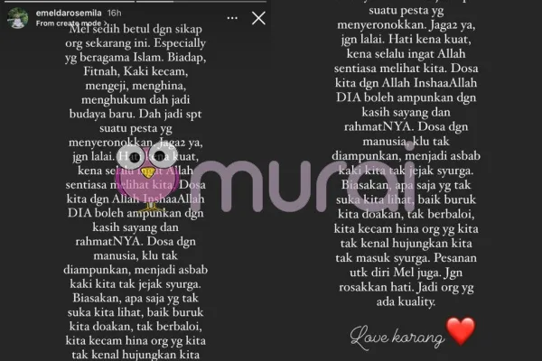 Pesanan untuk diri Mel juga. Jangan rosakkan hati. Jadi orang yang ada kualiti.” Tulisnya lagi