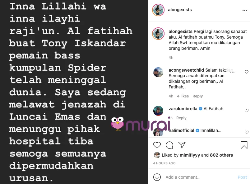 Meskipun begitu, hubungan Tony dan kumpulan Spider masih tetap utuh sehingga nafasnya yang terakhir. Al-Fatihah, salam takziah dari kami di Murai.my buat keluarga Tony dan anggota kumpulan Spider.