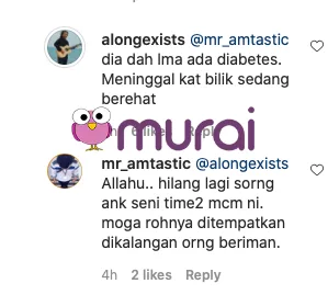 “Dia dah lama ada diabetes. Meninggal dekat bilik sedang berehat” komen Along ketika ditanya oleh seorang pengikutnya mengenai punca kematian Tony