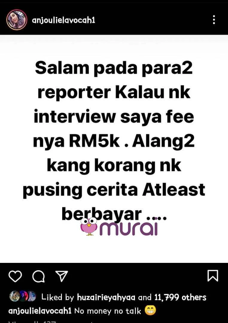 Dalam perkembangan lain, selebriti yang juga usahawan ini meminta bayaran sebanyak RM5,000 kepada mana-mana wartawan yang ingin menemuramahnya. Jelas Anju, dia telah mengenakan bayaran tersebut dipercayai akibat tidak berpuas hati dengan kisah yang tidak tepat mengenai dirinya sejak kebelakangan ini. Namun, hantaran tersebut telah dipadam tidak lama kemudian.