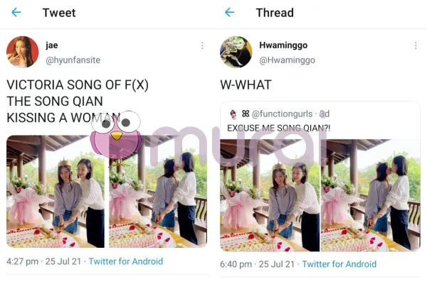 Kecoh di media sosial bila mana foto bekas ahli kumpulan f(x) Victoria Song bercumbu dengan aktres dari China Wang Xiaochen tersebar, ramai peminat dari Korea berasa terkejut dengan foto yang tular di Twitter ketika ini.