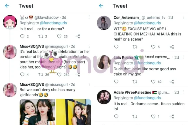 “Ianya benar tetapi ia sambutan hari lahir untuk rakan artisnya di set penggambaran. Victoria muncungkan bibir kemudian rakan artisnya itu mencium dia. Terlalu mesra bukan?” Ciap pengguna Twitter kedua