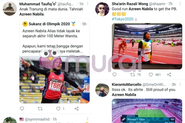 “Dia debut Olimpik pertama pada usia 21 tahun. Dia tidak berjaya keperingkat separuh akhir tetapi dia mampu berlari bersama pelumba lari terbaik dunia. Dari Malaysia guys, power. Bangga dengan kamu Azreen Nabila!!! Masa depan cerah!!!” ciap pengguna pertama
