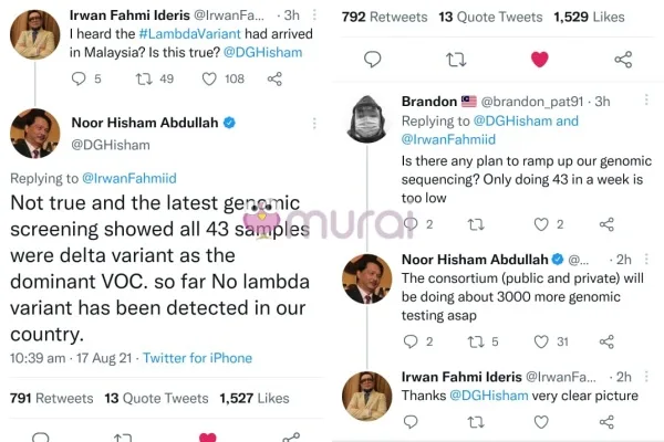 Dipetik dari laman Twitter Irwan Fahmi yang bertanya kepada doktor Noor Hisham, mengenai isu Varian Lambda yang dikatakan telah menular di Malaysia.